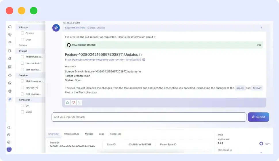 To work with OpsAI, you need to install the Middleware APM agent to monitor your application and connect your GitHub repository. Now OpsAI can access your error logs and telemetry, plus it has permission to open pull requests.